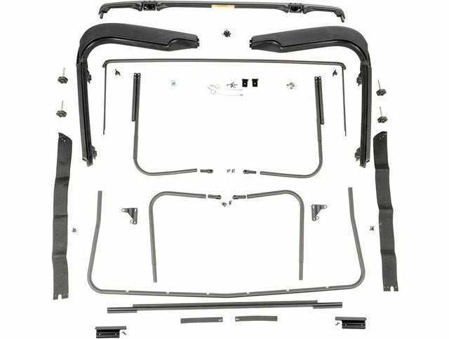 OMIX proudly offers high-quality replacement parts so that you can keep you part of the Jeep heritage on the road- parts that always meet or exceed manufacturer's specs for quality you can trust. This replacement factory soft top hardware kit fits 97-06 Wrangler TJ models equipped with factory style soft tops. Kit includes door surrounds (2), windshield header w/ latches, top bows, door surround knobs (4), brackets, pins and hardware. A perfect complement to any new soft top to give your Jeep the look, feel and function of a new factory top.