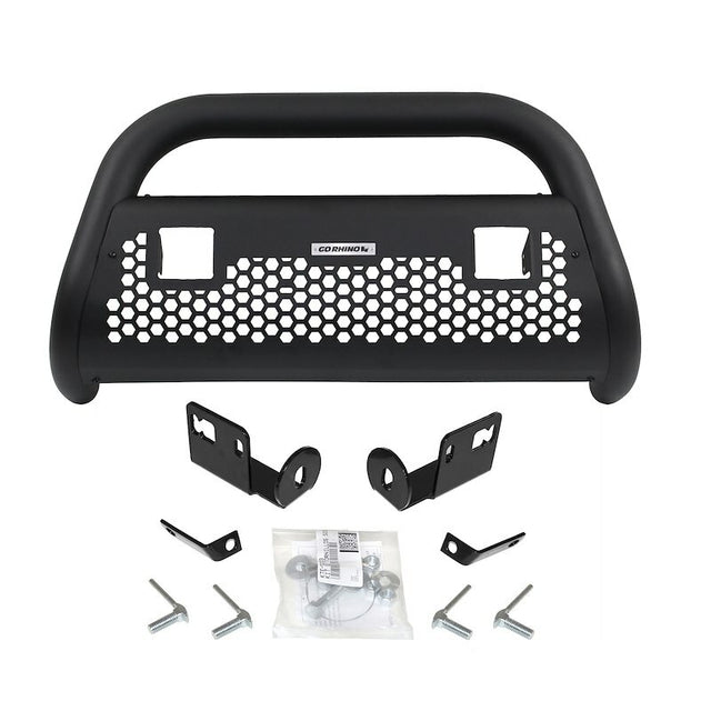 Go Rhino's RC2 LR Bull Bars offer updated styling and the ability to combine today’s popular LED lights with front-end protection. The 3" diameter tubular steel frame features a galvanized steel skid plate with a stylish hexagonal cut out pattern. Different styles are available with light mounts for one 20" single row light bar, two 3" cube lights or four 3" cube lights. In addition, all RC2 LR Bull Bars have pre-drilled light mount holes across the center crossmember. The RC2 LR is available as a standalone as a kit that includes vehicle-specific mounting brackets or as a kit that includes both mounting brackets and LED lights. Installation is easy with no drilling required. RC2 LR Bull Bars come with a Limited Lifetime warranty on materials and construction, a 5 year warranty on the Textured Black Finish and a 1 year warranty on the electrical compoenents.