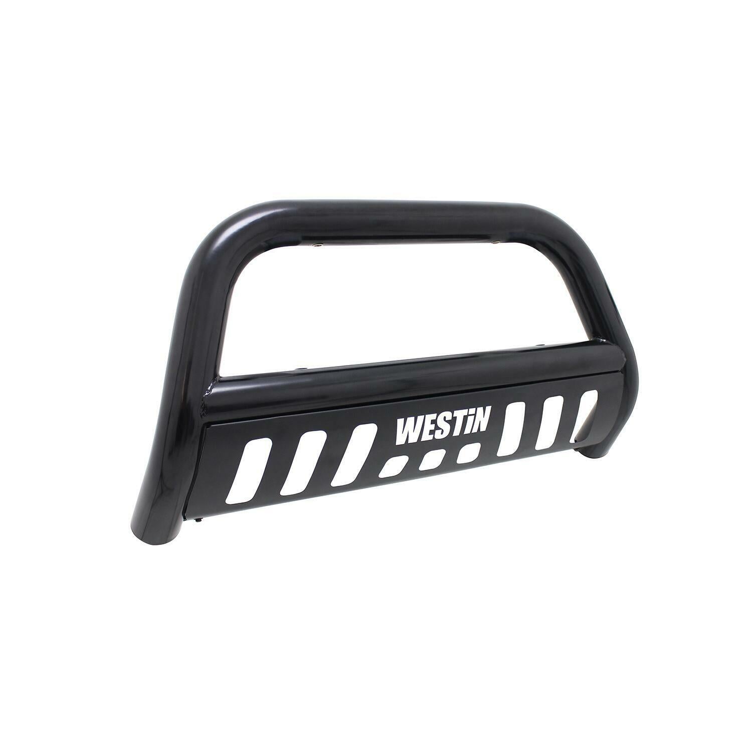 Westins E-Series Bull Bar is a front-end light bar designed for trucks and larger model SUVs. It mounts to the vehicles existing mounting points with no drilling required and comes complete with vehicle specific mount kit. It also features mounting points for 2 auxiliary lights up to 6 inches in diameter. The E-Series Bull Bar features a laser cut Westin block letter logo design on the skid plate. Available in black powder coated e-coated steel with a textured black skid plate backed by a 3 year warranty. Optional license plate bracket is available.