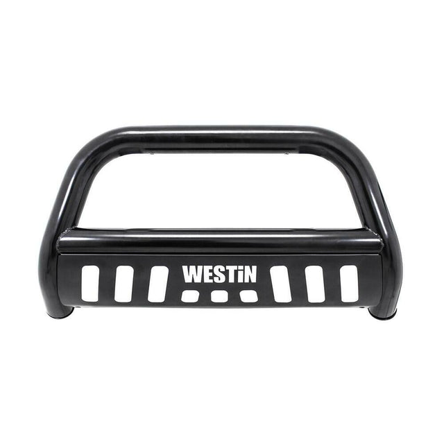 Westins E-Series Bull Bar is a front-end light bar designed for trucks and larger model SUVs. It mounts to the vehicles existing mounting points with no drilling required and comes complete with vehicle specific mount kit. It also features mounting points for 2 auxiliary lights up to 6 inches in diameter. The E-Series Bull Bar features a laser cut Westin block letter logo design on the skid plate. Available in black powder coated e-coated steel with a textured black skid plate backed by a 3 year warranty. Optional license plate bracket is available.