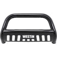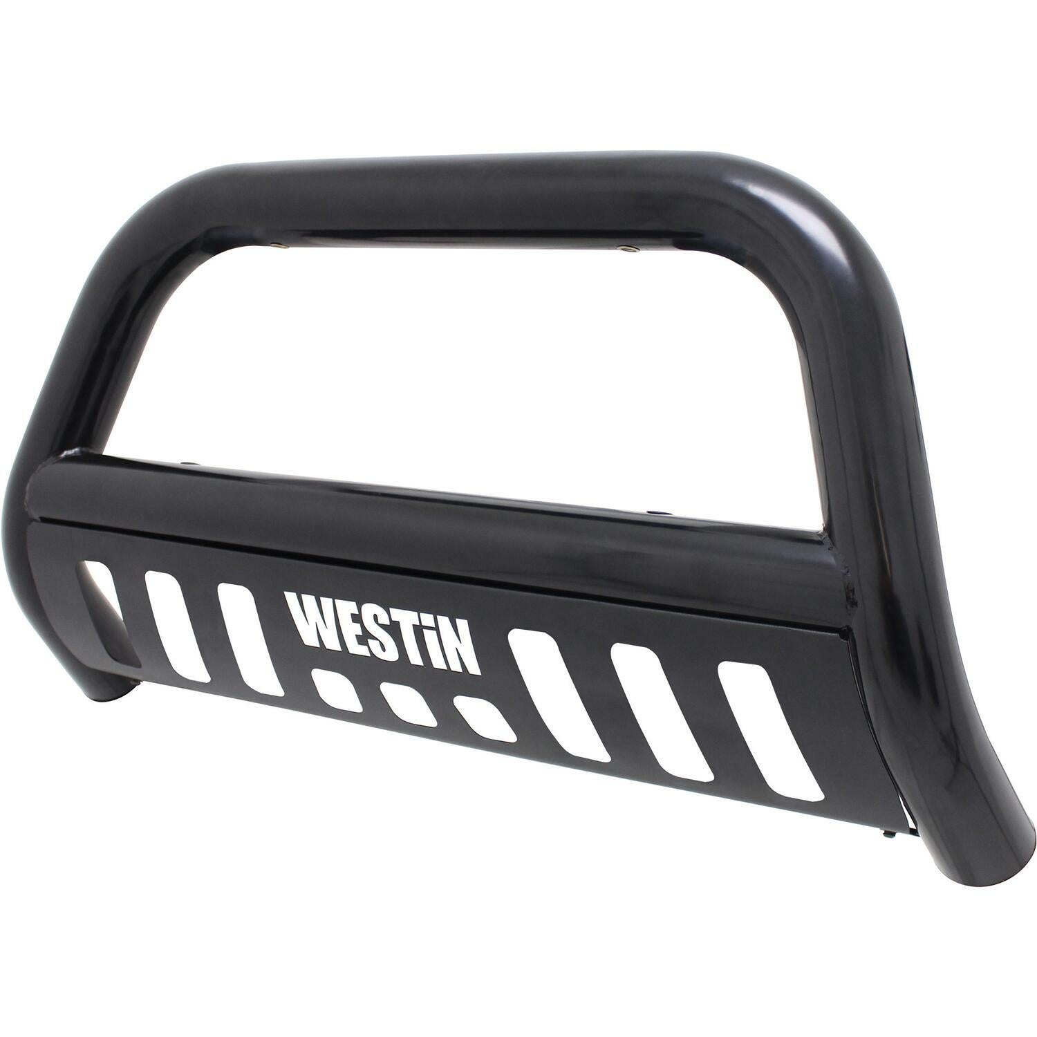 Westins E-Series Bull Bar is a front-end light bar designed for trucks and larger model SUVs. It mounts to the vehicles existing mounting points with no drilling required and comes complete with vehicle specific mount kit. It also features mounting points for 2 auxiliary lights up to 6 inches in diameter. The E-Series Bull Bar features a laser cut Westin block letter logo design on the skid plate. Available in black powder coated e-coated steel with a textured black skid plate backed by a 3 year warranty. Optional license plate bracket is available.