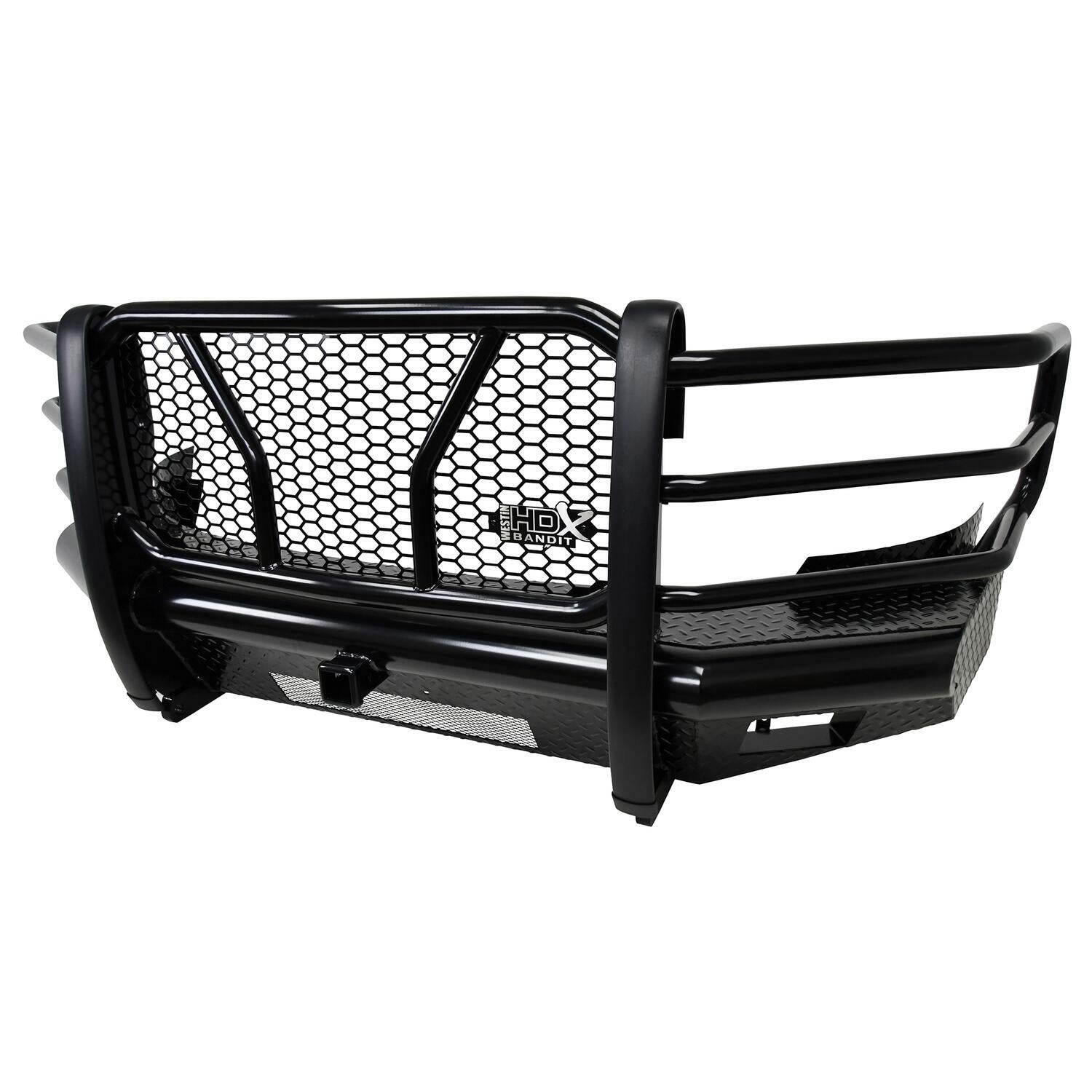 Westins HDX Bandit Bumper combines a heavy duty diamond plate steel bumper constructed of schedule 40 steel pipe with a stylish grille guard featuring 2" diameter outer wraparound wings and 2 3/4" wide upright rubber strips. Designed to protect headlights, grille, hood and front fenders from road hazards, debris and wildlife damage. Features a stylish metal honeycomb mesh screen, which allows maximum airflow to the intercooler or radiator area while accenting the front end styling with a clean and rugged look. Removable mesh screens allow for factory camera and adaptive cruise control options available on some late model Ford applications. HDX Bandit Bumper includes a built-in 2" receiver hitch and (2) heavy duty 9,500 lbs bow shackle mounts, capable of delivering multiple towing options. Compatible for factory fog lamps or LED post mount lights. In addition, some late model Ram and Chevrolet applications feature provisions for factory parking sensors. Bolt-on installation with hardware and mounting brackets included. Available in black powder coat finish.