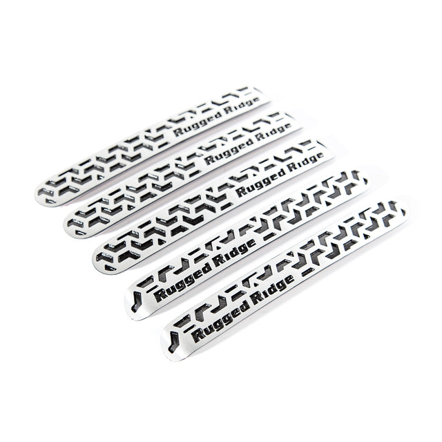 Bring a tasteful off-road accent to your JKU with Rugged Ridge Elite Door Handle Inserts featuring a cool tread-inspired inlay. Each insert is made from lightweight cast aluminum with a lustrous brushed finish and black recesses giving an eye-catching custom touch to your rig. Kit Includes 5 inserts, for all doors and rear tailgate. These inserts install with ease with double-sided automotive tape. No sharp edges result in a comfort-fitting install.