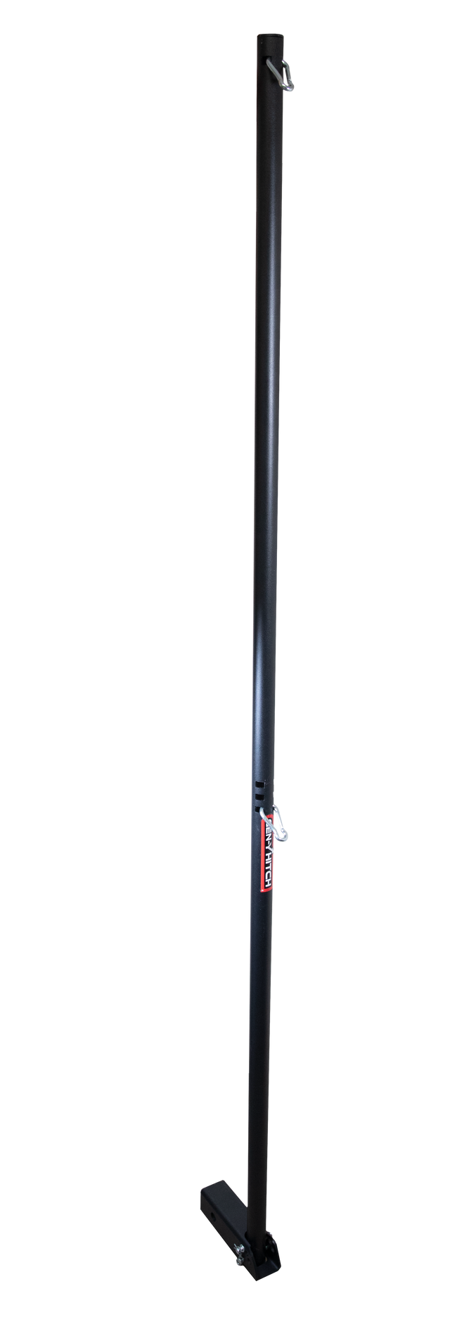 The GEN-Y Flag Pole can be inserted directly into the vehicle receiver or a GEN-Y Hitch (in the stacked tube side). You can angle the flag pole to three different angles and attach a 3' x 5' flag to it. It is lightweight, heavy-duty and powder coated with a durable black, matte color.