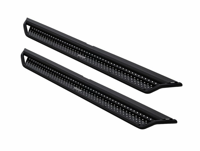 The Go Rhino Dominator D1 is a cab length slider with drop down step designed for both the daily driver and the recreational off-roader. The D1 is constructed of powder coated steel tubing that provides slider protection from trail obstacles and road debris along the rocker panel of vehicle. The wide step area and mesh stepping plate allows for easy access in and out of a lifted vehicle and the raised hex pattern offers a no-slip grip. Installation is easy and the utilization of the OEM step and rock rail mount locations means no drilling or cutting required. Hardware and brackets are included. The D1 Side Steps come with a Limited Lifetime warranty on materials and construction and a 5 year warranty on the Textured Black Finish.