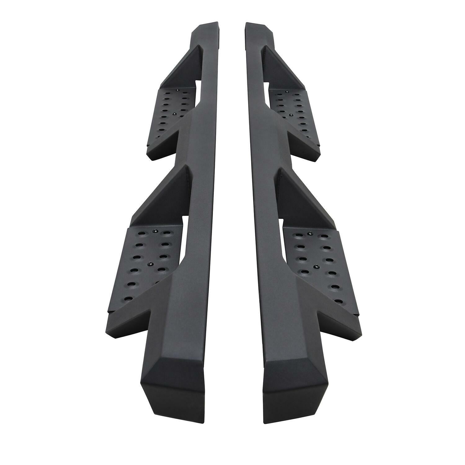 Westins HDX Drop Nerf Step Bars provide the rugged look and function that truck owners need and want. They feature a solid 1-piece steel construction and heavy duty punch plates creating high traction step areas. The HDX Drop Nerf Step Bars also feature Westins notched bar design which provides more than 2" of additional toe/heel placement versus competitive brands. Available in a textured black finish that complements Westin HDX Bumpers. The HDX Drop Steps have vehicle specific applications and include a vehicle specific mount kit, installation hardware and instructions.