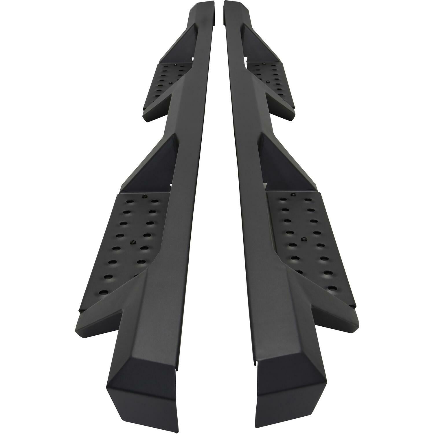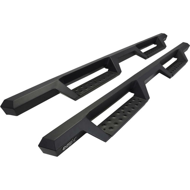 Westins HDX Drop Nerf Step Bars provide the rugged look and function that truck owners need and want. They feature a solid 1-piece steel construction and heavy duty punch plates creating high traction step areas. The HDX Drop Nerf Step Bars also feature Westins notched bar design which provides more than 2" of additional toe/heel placement versus competitive brands. Available in a textured black finish that complements Westin HDX Bumpers. The HDX Drop Steps have vehicle specific applications and include a vehicle specific mount kit, installation hardware and instructions.