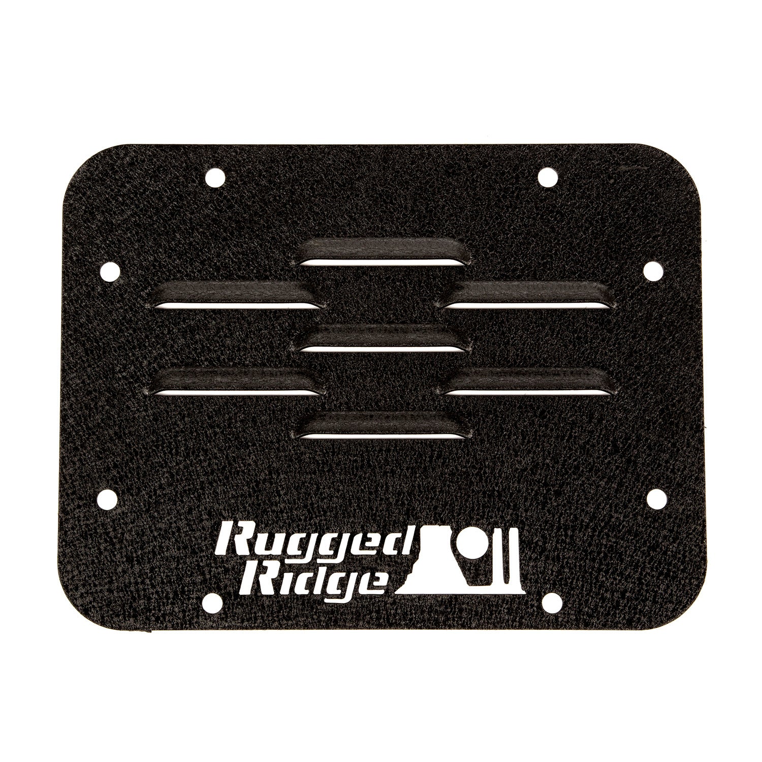 The Rugged Ridge Spare Tire Delete Plate eliminates the factory spare tire carrier on 2007-2018 Wrangler JK models for reduced weight, greater rear visibility and improved departure angles when off-road driving. Stamped from brawny steel plate, precisely drilled to match the JK tailgate and given a black textured powder coat, each Spare Tire Delete Plate is engineered to look like a factory-quality part in both fit and finish. With seven pressed vent louvers and an eye-catching cutout logo, the Rugged Ridge Spare Tire Delete Plate is a serious styling upgrade for anyone who prefers the hardcore off-road image or simply runs a tire too large for conventional carry. The Rugged Ridge Tire carrier Delete Plate is also available in a complete kit that includes both a low-profile license plate bracket and high-mount brake light relocation bracket for a total tailgate makeover.