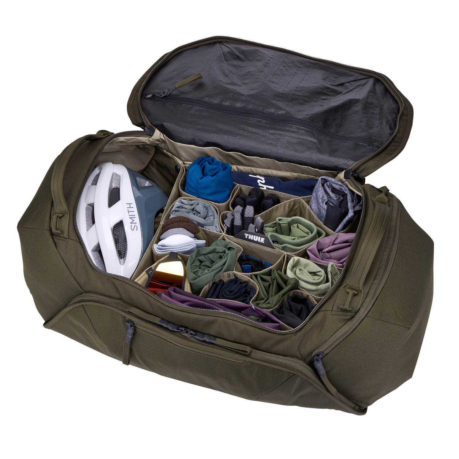 Keep all your cycling gear available and organized from wherever your ride begins - at the trailhead, race start, weekend destination or at home|55L total capacity holds 3-5 days of road bike or mountain bike gear, including seasonal accessories|Organize coordinating kits, jackets and accessories in individual cell pockets|bluesign® is a strict international criteria that ensures the protection of workers, consumers, and the environment|Visibility and efficient access to all compartments thanks to the bag structure and wide opening|Dedicated shoe pocket is lined with tarpaulin for easy cleaning|Comfortably pack any size road or trail helmet in the dedicated compartment|Store dirty laundry or after-ride clothing in the versatile lid pocket|Wear the removable shoulder strap in cross-body configuration for stable carrying while walking or riding a bike|Keep nutrition, small tools or race supplies visible but separate from clothing in front pocket|Protect GPS or keep wallet secure in the exterior zipper pocket|Protect wrap-around riding glasses while in transit in structured, soft-lined compartment
