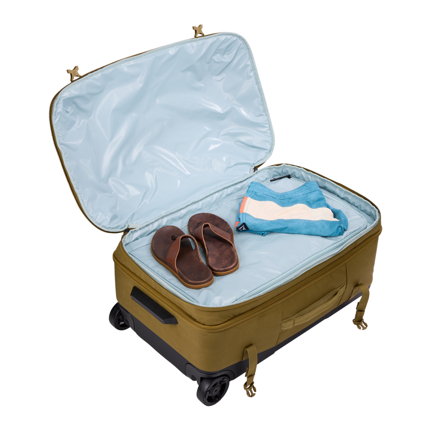 Large coated storage pocket allows you to store gym clothes or a bathing suit without moisture or dirt spreading to the rest of the bag|Tough, oversized wheels and the V-tubing telescoping handles glide with ease on any terrain|Bag design absorbs the impact of travel with its durable, molded polycarbonate back panel|Interior compression strap system helps keep items in place while exterior compression straps help reduce the overall size of the bag|Exterior zipper sliders can be locked together for added security (locks sold separately)|Outer shell fabric and lining are made of 100% recycled polyester from recycled plastic bottles, while the polycarbonate back panel is made of 50% recycled material|600D waxed canvas shell fabric is highly durable, repels moisture, dirt, and stains and includes a water-resistant coating free of PFCs, chemicals that can be harmful to the environment|Built in ID card slot simplifies identification of bag|bluesign® is a strict international criteria that ensures the protection of workers, consumers, and the environment