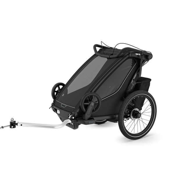 4 activities – designed to excel when you bike, jog, stroll, and ski (Jogging and Ski Kits sold separately). The included rain cover and sun canopy keep your child dry and shields them from the sun|Integrated LED light powered by the Thule power bank 10k (sold separately) for better visibility in all conditions|For increased control on steeper terrain and while running|Convenient one-hand recline and fully padded seat for on the go naps|The redesigned FlipWing-system allows for even easier switching between biking and strolling and back, now with the possibility to flip the wheels up and down while the trailer is attached to the bike|The new hitch arm allows the user to easily and securely attach and detach the trailer to the bike using only one hand|Adjustable suspension to allow you to customise the comfort of the ride as your child grows or if you transport heavier items in the trailer|Large cargo basket with zipper for more secure storage of items, that can be stored away for increased kick stride while jogging|Compact, easy to operate folding mechanism makes it easier than ever to bring the carrier with you|Climate controlled interior with removable windows and multi-adjustable sun visor. Vents ensure optimal airflow and climate control, removable clamps provide more ventilation when using a rain cover|Thule Click n’ Store makes for convenient on-board storage of strolling, jogging, and cycling kit while in different activity mode|Comfortable padded seats are removable and easy to clean