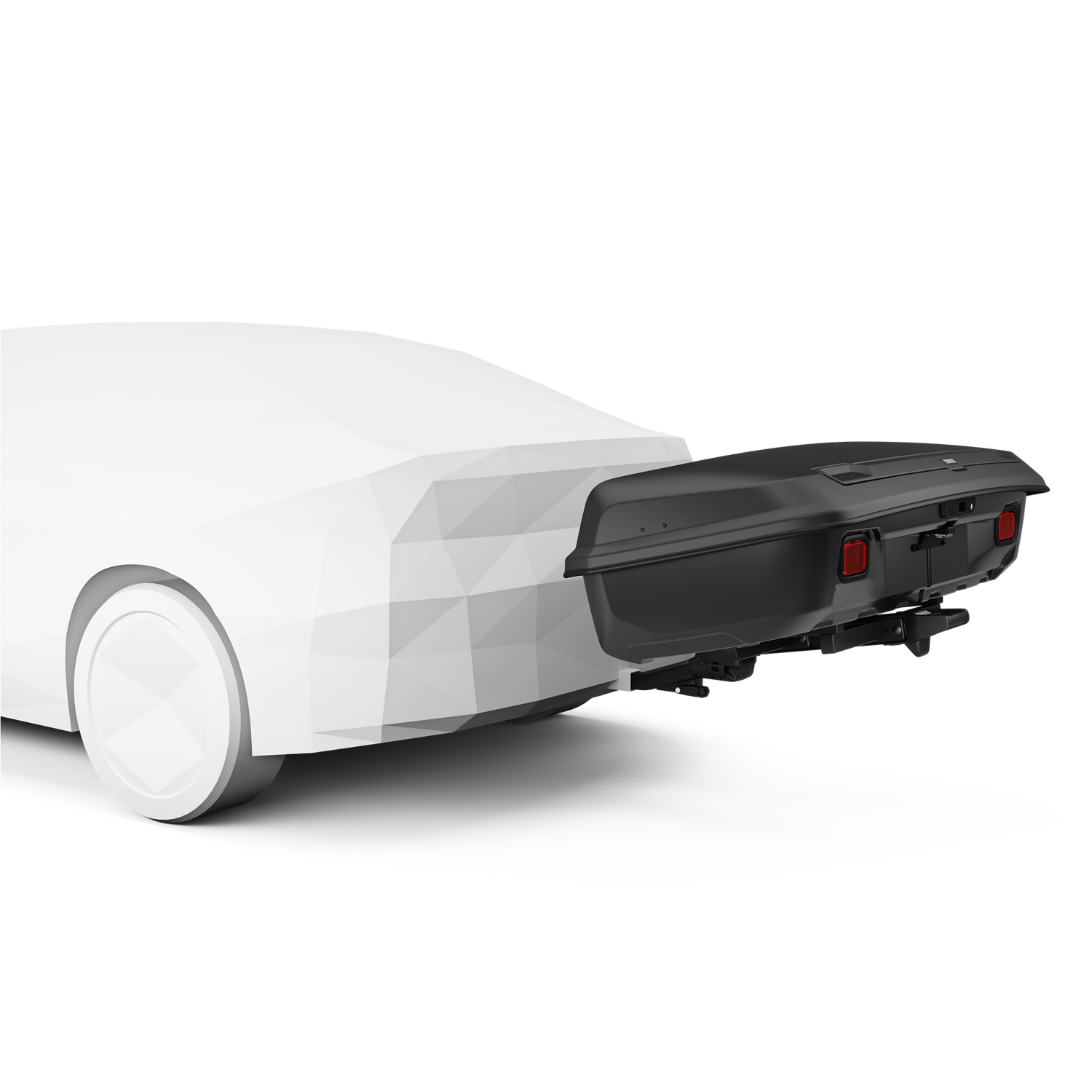 The Thule Arcos platform is required to successfully install your Thule Arcos rear cargo carrier|The tool-free and lockable AutoAttach system, with lockable AcuTight lever (lock included), allows for quick and secure mounting and removal of the rack|Patented outboard release handle provides easy hand-activated tilting for rear cargo access with or without bikes. Quickly tilts up to stow vertically when not in use, reducing the rear footprint|Folds up vertically when not in use, reducing the rear footprint