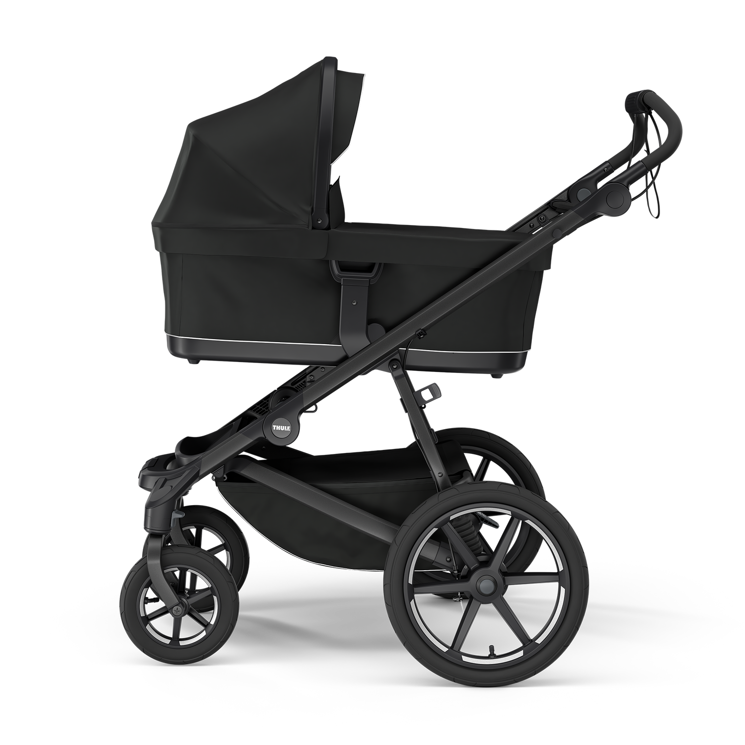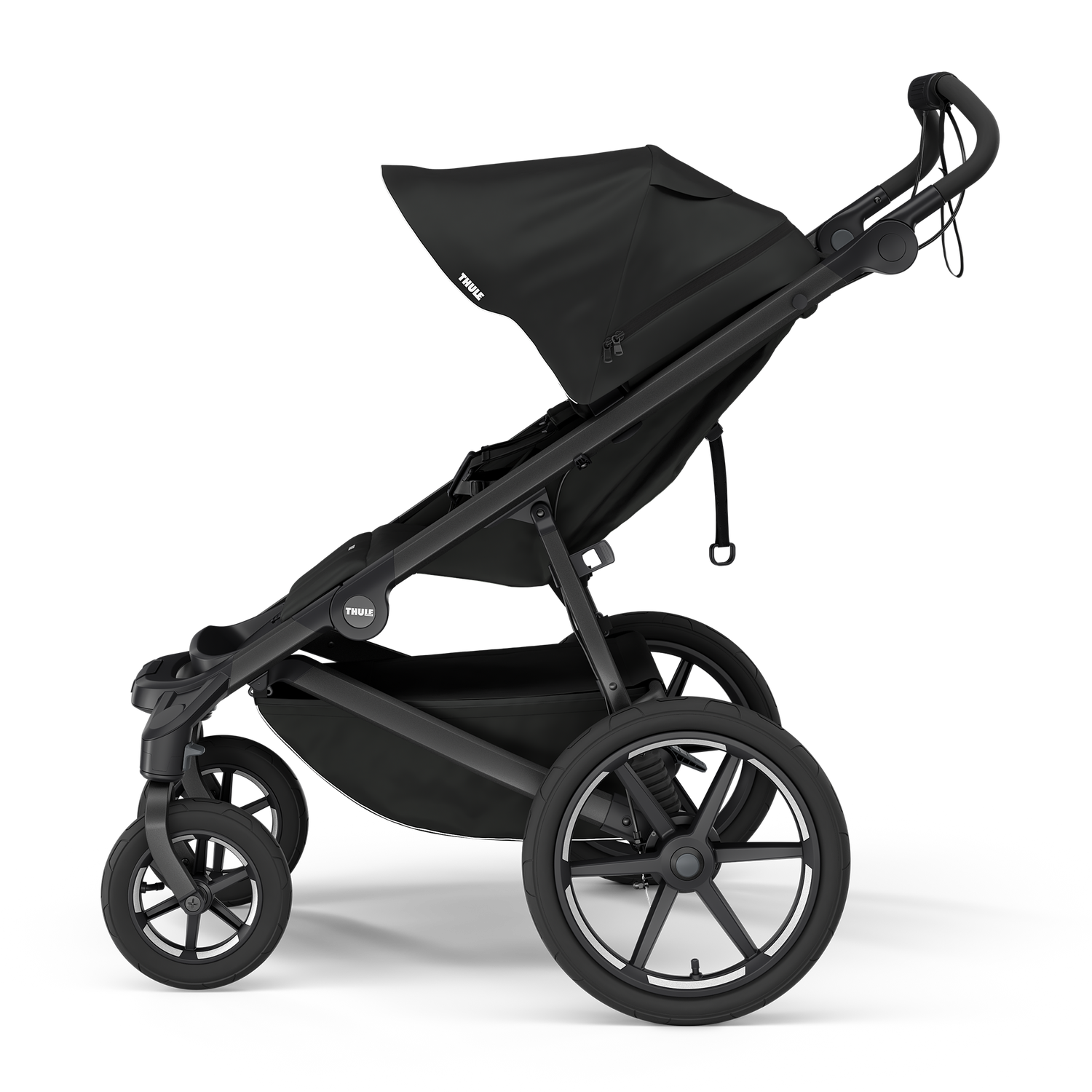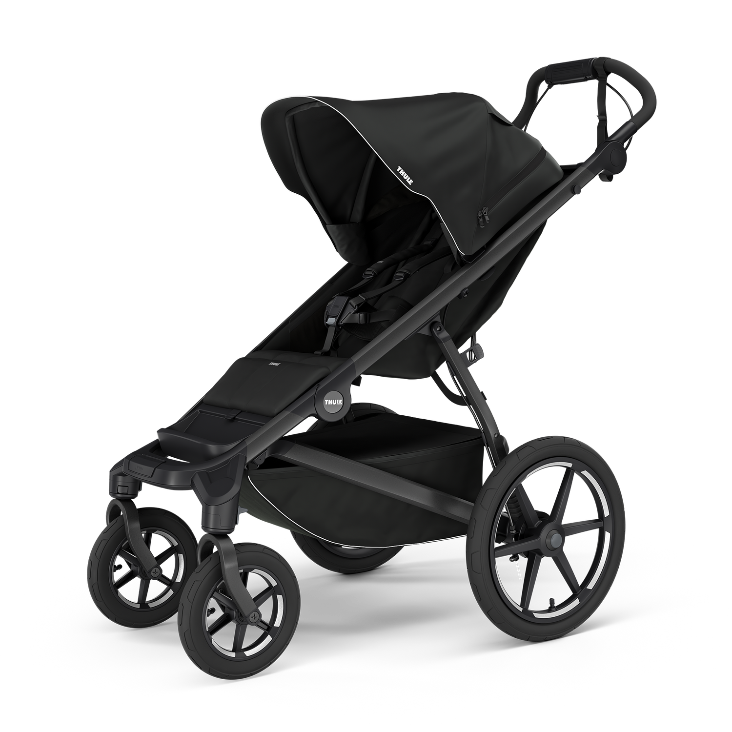The swivel front wheels, which lock into place depending on terrain, combined with large rear wheels, makes the stroller lightweight and easy to maneuver|Built-in legrest and comfortable seat with adjustable recline gives full child comfort all day whether taking in the sights or a nap|Easy, one-hand, compact fold with self-stand feature for easy storage and transportation|Integrated twist hand brake for smooth, safe speed control on any terrain|Can be used from birth with Thule bassinet or infant car seat adapter (sold separately)|Large cargo basket that holds up to 10 kg/22 lbs with zip-top cover, a rear mesh pocket, and two mesh compartments for snacks or toys provides ample space to bring everything you need|Secure and comfortable seat with easily adjustable 5-point padded harness with magnetic buckle|Large canopy with full coverage and ventilation ensures your child is comfortable|Quality suspension combined with air-filled tires makes for a smooth ride for both parent and child on any terrain|Ergonomic, adjustable handlebar for maximum parent comfort|Reflective feature on canopy and wheels ensures visibility and safety