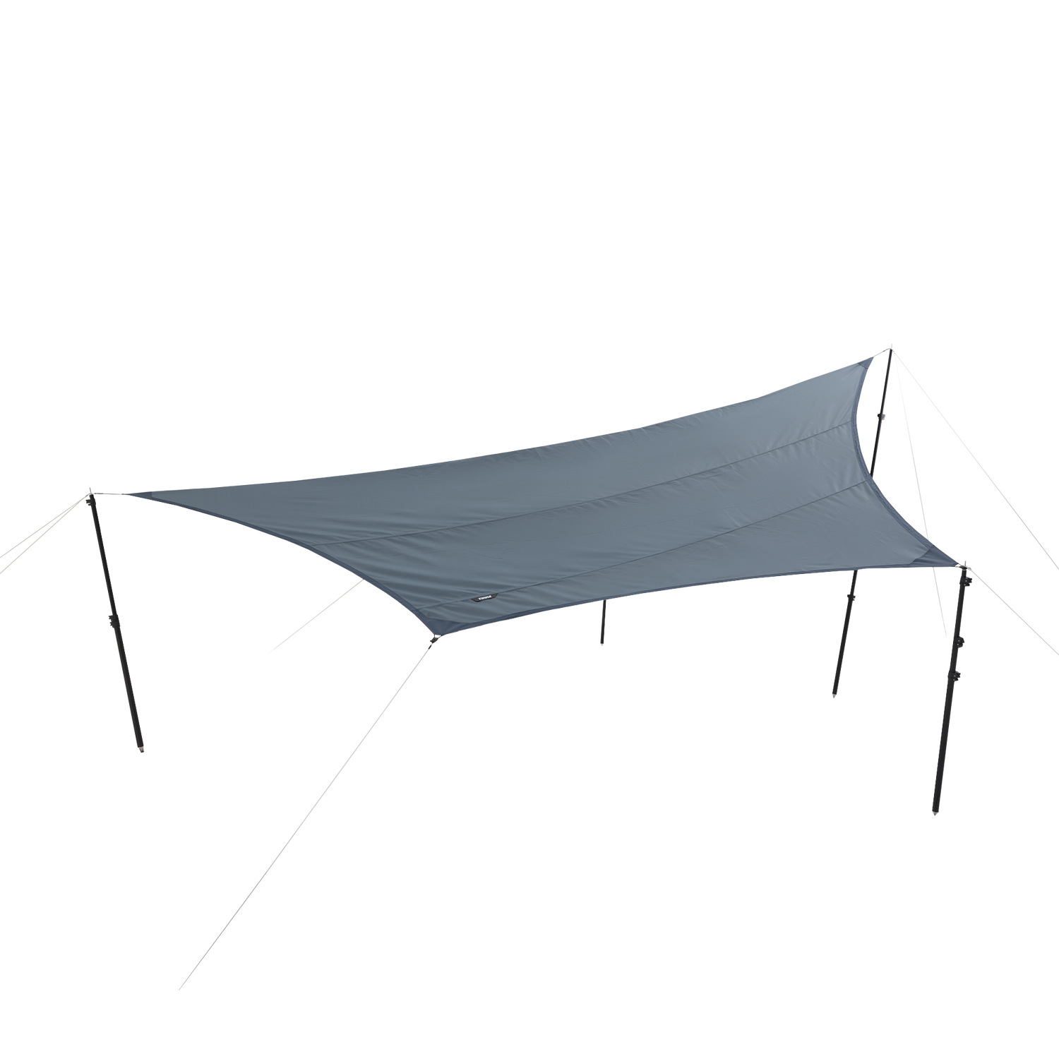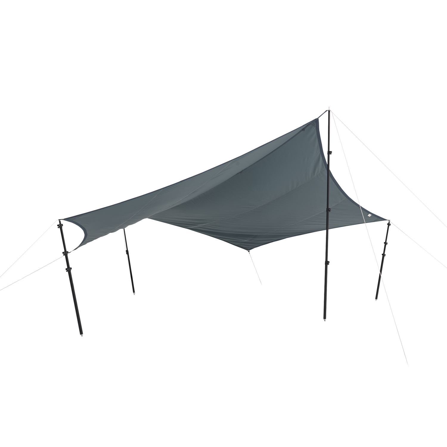The tarp includes four poles for multiple configurations, providing great flexibility|Made from durable 200D Oxford polyester with reinforced corners, ensuring longevity and strength in all conditions|Equipped with webbing loops that allow for mounting accessories such as lighting or other gear|The tarp comes with poles, stakes, and tie-out lines, and is easy to set up and pack away with the included storage bag