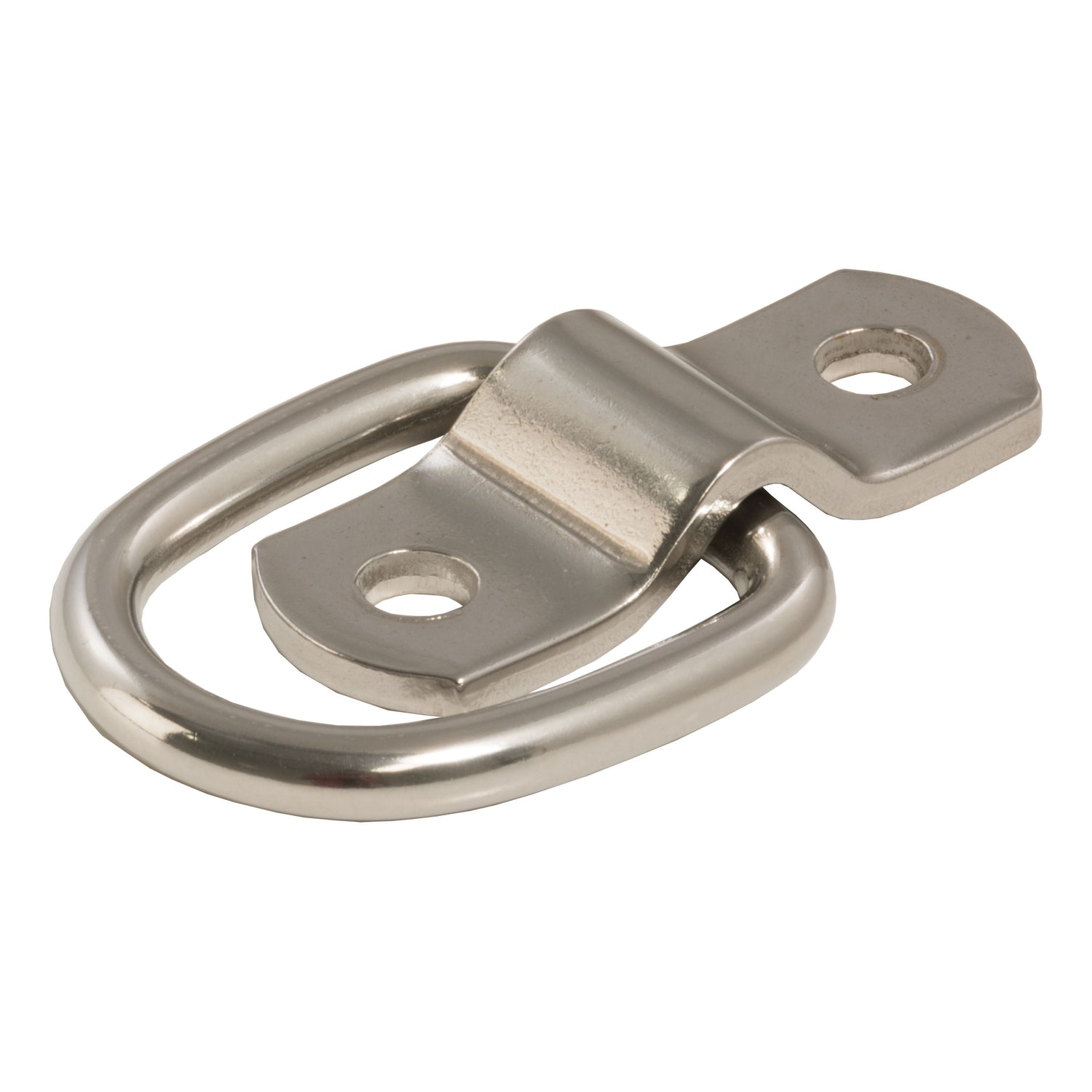 Making sure that your cargo is tied down and fully secure for the journey is important for any towing job. Not only is unsecured cargo a danger to you, your passengers and your fellow drivers, but it can also cause damage to your trailer, pickup truck bed or vehicle cargo area, as well as to the cargo itself. Together with our cargo straps and safety chains, CURT tiedown anchors are easy to mount in any trailer, truck or full-size van, and they help keep your items safe for the road ahead. This particular D-ring tiedown anchor is designed to be surface mounted and add a convenient anchoring point for cargo straps, ropes or cables. It comes with a 2-1/4" x 13/16" mounting bracket and two 1/4" diameter mounting holes, spaced 1-1/2" apart, center to center. This rope ring features corrosion-resistant stainless steel construction and offers a working load capacity of 1,200 lbs. (2,400 lbs. break strength). Mounting screws are not included in this package.