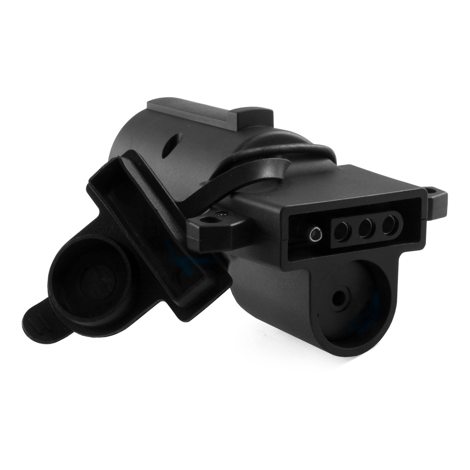 There are several different types of connectors used to supply power from a tow vehicle's electrical system to a trailer's wiring system. Some trailers only need the bare essentials -- running lights, brake lights and turn signals -- while others require a connection for reverse lights, electric brakes and auxiliary power. With connectors ranging from simple to complex, it may be the case that the connection between your vehicle and your trailer is not a perfect match. For example, your truck may be equipped with a 6-way round socket, but your trailer may have a 4-way flat plug. For this very common problem, CURT offers a quick and simple solution in the form of an electrical adapter. An adapter is an electrical device that allows a connection to be made between a mismatched trailer plug and vehicle socket. It easily plugs in your vehicle's electrical socket and usually requires no additional wiring. CURT offers an array of adapters to accommodate most types of plugs and sockets, including 4-way flat, 4-way round, 5-way flat, 6-way round, 7-way RV blades and more. This electrical adapter is actually designed to adapt a 7-way RV blade to a 4-way flat vehicle socket. It comes with its own backup alarm to send out an audible signal when your vehicle is in reverse and a dust cover to protect from dirt, water and road grime. All CURT wiring and electrical products come with a one-year limited warranty to give you the assurance you need to tow with confidence.