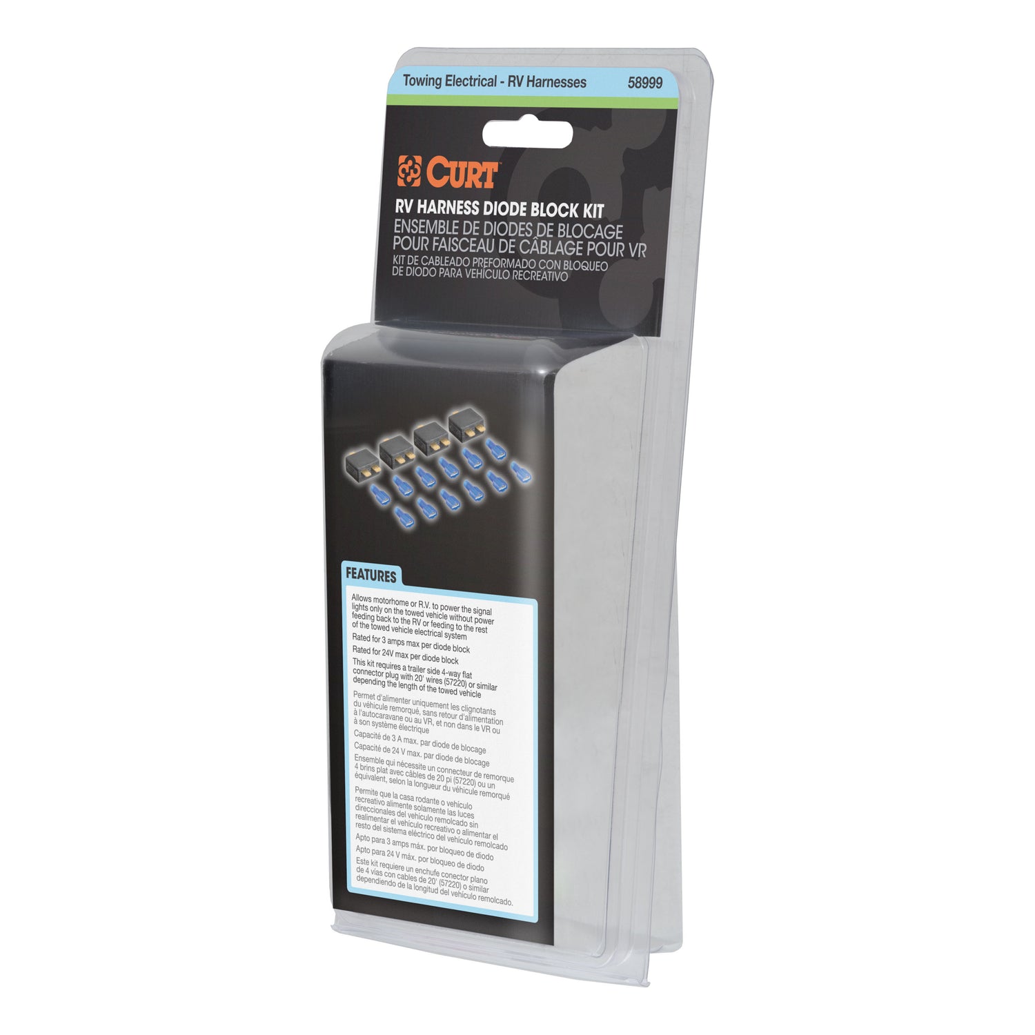 This kit allows a motorhome or RV dinghy-towing a vehicle to power the signal lights only on the towed vehicle without power feeding back to the RV or feeding to the rest of the towed vehicle's electrical system. It is rated for 3 amps max per diode block and 24V max per diode block. This kit requires a trailer-side 4-way flat connector plug with 20' wires (such as the CURT #57220) or similar, depending the length of the towed vehicle.