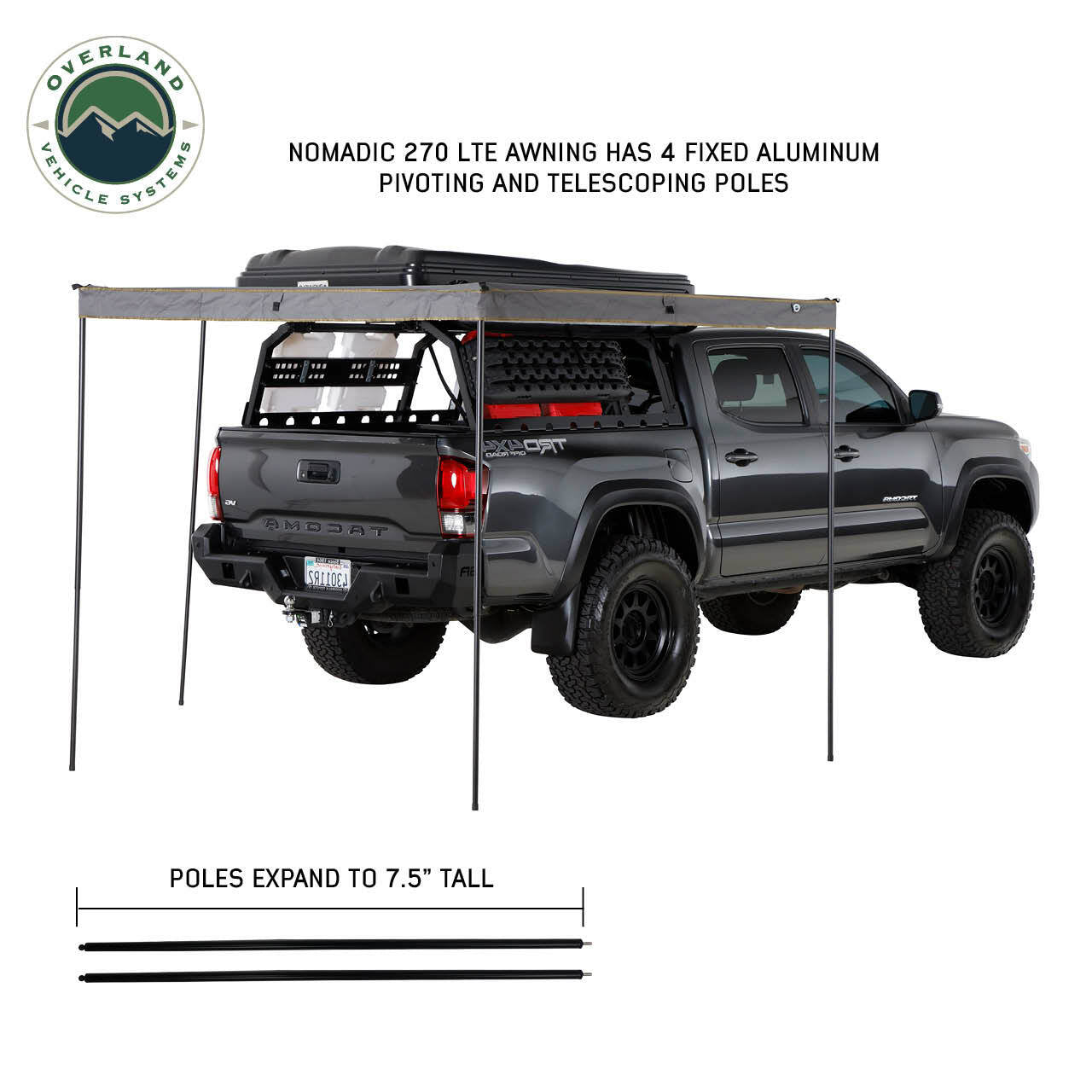 The Overland Vehicle Systems Nomadic 270LTE Awning is an excellent choice for anyone looking for a high-quality, durable awning. With its 270-degree coverage, this awning provides plenty of shelter for you, your family, or friends. We've taken our best in class Nomadic 270 Awning, Nomadic 270LT Awning, Nomadic 180 Awnings and tweaked a few things to design the Nomadic 270LTE Awning for customers that need a lighter and more compact design without sacrificing functionality. Whether you're an experienced Overlander, Camper, Outdoors Enthusiast, Adventurer or just getting started, the Overland Vehicle Systems Nomadic 270LTE Awning is an excellent choice for you. Superior FunctionalityThe Overland Vehicle Systems Nomadic 270LTE Awning requires no poles for set-up, thanks to the reinforced oversize hinge and heavy-duty rafters. The Nomadic 270LTE Awning is made from 280G poly cotton rip stop material with heat sealed seams, ensuring that you won't have any leaks, no matter what size rain you're dealing with. Plus, if you see bad weather coming, you can quickly deploy the four pivoting aluminum poles and use the supplied ropes to provide to provide stability to the awning. The 270 degree design means you'll have plenty of protection from the sun and other elements. And, if necessary, you can even add the optional Nomadic 270LTE Awning walls to take on mother nature. When it's time to pack up, the awning easily folds and secures in a 1000g PVC cover. So, whether you're needing protection from the sun or inclement weather, the Overland Vehicle Systems Nomadic 270LTE Awning has you covered. FeaturesThe Overland Vehicle Systems Nomadic 270LTE Awning is the perfect solution for anyone in need of reliable, free-standing shelter. Made with quality materials, this awning provides up to 75 square feet of coverage and can be used at a full 270 degrees. The Overland Vehicle Systems Nomadic 270LTE Awning is both easy to set up, the Nomadic 270LTE Awning is supported by 4 integrated drop-down legs, 4 integrated 1 1/8 inch tubular heavy-duty rafters supported on a Heavy-Duty Aluminum Frame. The Nomadic 270LTE Awning is made from 280G poly cotton rip stop material with heat sealed seams, easily folds, and secures in a 1000g PVC cover. This Nomadic 270LTE awning features a universal L mounting bracket solution that can be mounted onto a variety of roof racks, making it perfect for your off-road rig. The awning comes with a 4-year warranty, ensuring your satisfaction. IncludedQTY 1 Overland Vehicle Systems Nomadic 270LTE Awning Passenger Side, Hardware, Stakes, Tension Straps, Ropes, and Free Shipping Four-Year Limited WarrantyOverland Vehicle Systems Nomadic 270LTE Awning comes with an industry best 4 Year Limited Warranty. Overland Vehicle Systems warranty includes coverage for products with manufacture defects in materials and workmanship.