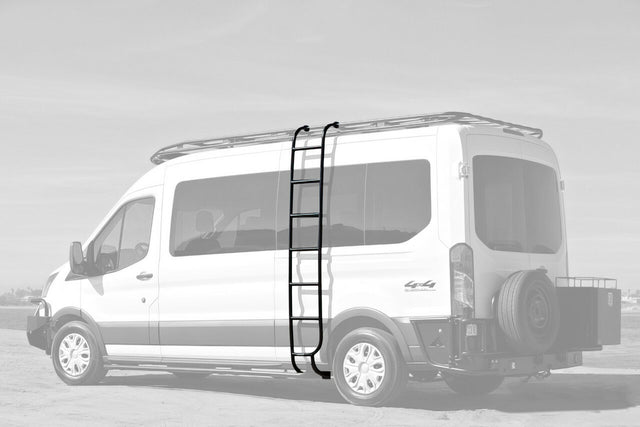 210275.1-Ford Transit Tall Roof Ladder - Must Mount to Aluminess Roof Rack* If you have a roof rack then access to the roof is a must. Our aluminum Side Ladder for the Ford Transit provides quick and easy access to your roof rack without the need to drill through the rear door of your vehicle. Our driver side ladder sits about 5" away from the van which gives you ample space to climb but is tight enough to the body of your Transit to easily avoid any obstacles.