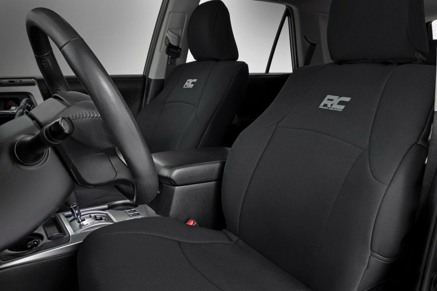 Want to protect your seats or are your seats showing signs of wear and tear from daily use? Say goodbye to unsightly stains and deterioration with Rough Country's Neoprene Seat Covers - the ultimate solution for preserving your vehicle's interior. Snug Fit for Optimal Protection: Our seat covers are tailored to fit your seats perfectly providing a protective barrier against spills scratches and everyday wear and tear. Factory-Spec Construction: Engineered to meet factory specifications our covers blend seamlessly with your vehicle's interior giving it a fresh new look without compromising on quality or style. Four-Layer Defense: With a four-layer construction featuring foam padding and a durable polyester shell our seat covers offer unmatched protection and longevity ensuring your seats stay looking new for years to come. Breathable and Water-Resistant: The neoprene layer not only provides breathability for added comfort but also boasts water-resistant properties safeguarding your seats from spills and stains. Complete Coverage: Our covers come with full protection for your front seats including headrest covers where applicable as well as rear covers to shield your back seats from children and pet-related mishaps. Peace of Mind Warranty: Rest easy knowing your purchase is backed by our two-year warranty giving you confidence in the durability and reliability of our product. Don't let worn-out seats diminish your driving experience. Upgrade to Neoprene Seat Covers today and enjoy a fresh stylish interior that's protected against the rigors of daily life on the road.
