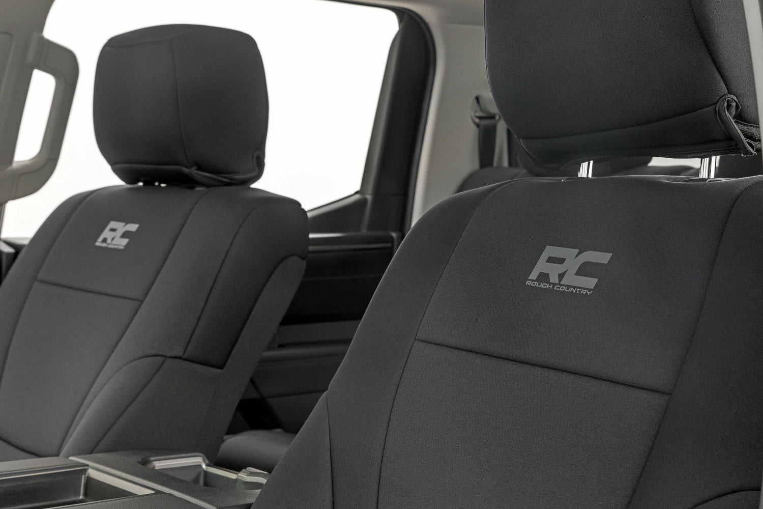 Want to protect your seats or are your seats showing signs of wear and tear from daily use? Say goodbye to unsightly stains and deterioration with Rough Country's Neoprene Seat Covers - the ultimate solution for preserving your vehicle's interior. Snug Fit for Optimal Protection: Our seat covers are tailored to fit your seats perfectly providing a protective barrier against spills scratches and everyday wear and tear. Factory-Spec Construction: Engineered to meet factory specifications our covers blend seamlessly with your vehicle's interior giving it a fresh new look without compromising on quality or style. Four-Layer Defense: With a four-layer construction featuring foam padding and a durable polyester shell our seat covers offer unmatched protection and longevity ensuring your seats stay looking new for years to come. Breathable and Water-Resistant: The neoprene layer not only provides breathability for added comfort but also boasts water-resistant properties safeguarding your seats from spills and stains. Complete Coverage: Our covers come with full protection for your front seats including headrest covers where applicable as well as rear covers to shield your back seats from children and pet-related mishaps. Peace of Mind Warranty: Rest easy knowing your purchase is backed by our two-year warranty giving you confidence in the durability and reliability of our product. Don't let worn-out seats diminish your driving experience. Upgrade to Neoprene Seat Covers today and enjoy a fresh stylish interior that's protected against the rigors of daily life on the road.