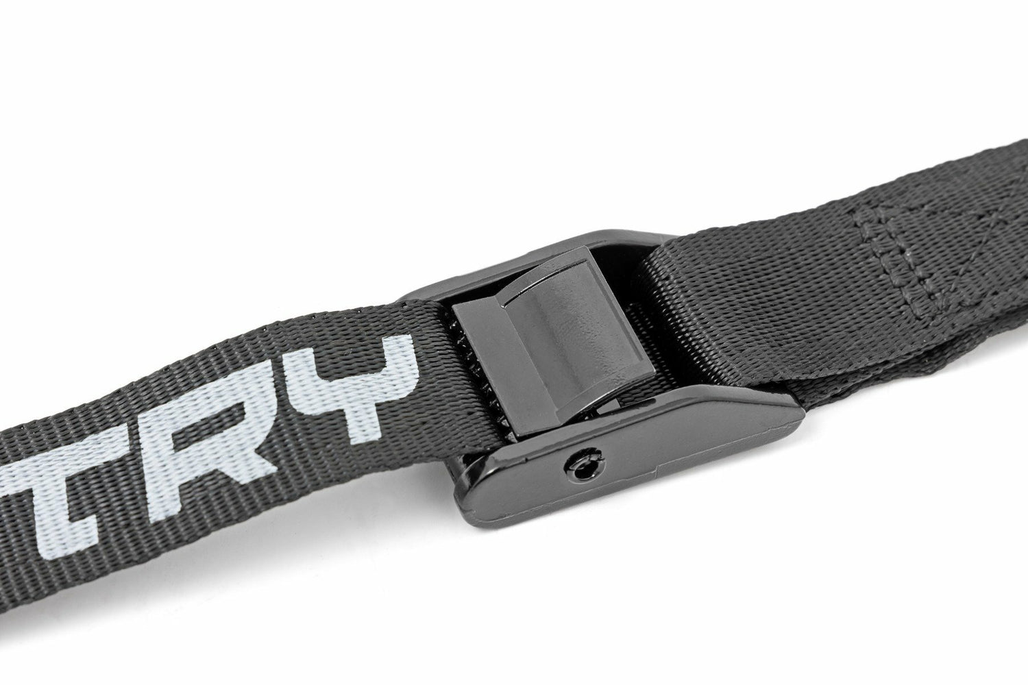 Are you tired of your gear shifting around like crazy every time you hit the road? Our Cargo Tie-Down Straps are here to solve that problem! Made with heavy-duty nylon woven fiber these straps are built to handle whatever you throw their way. The adjustable cam buckle design ensures a secure fit while extra stitching at the strap loop adds strength where you need it most. Plus the corrosion-resistant black finish on the cam buckle means these straps can take on any weather conditions without missing a beat. Whether you're hauling camping supplies hunting gear or anything in between our Cargo Tie-Down Straps are up to the task. Ditch the flimsy ropes and bungee cords our Tie-Down Straps keep everything securely in place so you can focus on the road ahead. Say goodbye to chaos and hello to peace of mind with Rough Country's Cargo Tie-Down Straps.