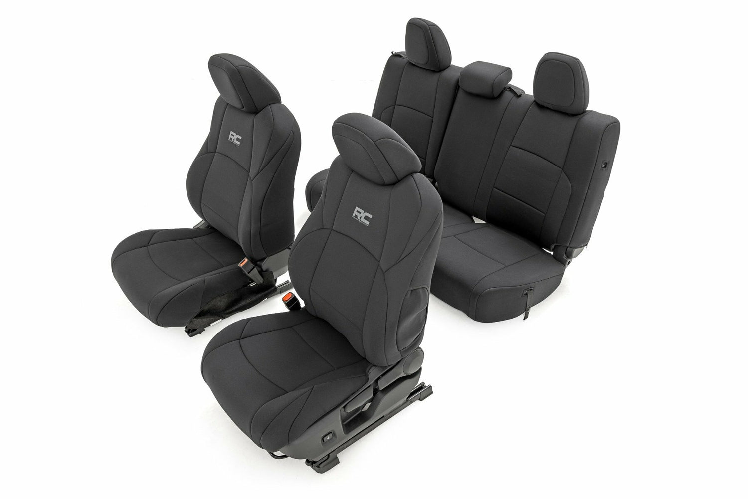 Want to protect your seats or are your seats showing signs of wear and tear from daily use? Say goodbye to unsightly stains and deterioration with Rough Country's Neoprene Seat Covers - the ultimate solution for preserving your vehicle's interior. Snug Fit for Optimal Protection: Our seat covers are tailored to fit your seats perfectly providing a protective barrier against spills scratches and everyday wear and tear. Factory-Spec Construction: Engineered to meet factory specifications our covers blend seamlessly with your vehicle's interior giving it a fresh new look without compromising on quality or style. Four-Layer Defense: With a four-layer construction featuring foam padding and a durable polyester shell our seat covers offer unmatched protection and longevity ensuring your seats stay looking new for years to come. Breathable and Water-Resistant: The neoprene layer not only provides breathability for added comfort but also boasts water-resistant properties safeguarding your seats from spills and stains. Complete Coverage: Our covers come with full protection for your front seats including headrest covers where applicable as well as rear covers to shield your back seats from children and pet-related mishaps. Peace of Mind Warranty: Rest easy knowing your purchase is backed by our two-year warranty giving you confidence in the durability and reliability of our product. Don't let worn-out seats diminish your driving experience. Upgrade to Neoprene Seat Covers today and enjoy a fresh stylish interior that's protected against the rigors of daily life on the road.