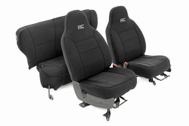 Want to protect your seats or are your seats showing signs of wear and tear from daily use? Say goodbye to unsightly stains and deterioration with Rough Country's Neoprene Seat Covers - the ultimate solution for preserving your vehicle's interior. Snug Fit for Optimal Protection: Our seat covers are tailored to fit your seats perfectly providing a protective barrier against spills scratches and everyday wear and tear. Factory-Spec Construction: Engineered to meet factory specifications our covers blend seamlessly with your vehicle's interior giving it a fresh new look without compromising on quality or style. Four-Layer Defense: With a four-layer construction featuring foam padding and a durable polyester shell our seat covers offer unmatched protection and longevity ensuring your seats stay looking new for years to come. Breathable and Water-Resistant: The neoprene layer not only provides breathability for added comfort but also boasts water-resistant properties safeguarding your seats from spills and stains. Complete Coverage: Our covers come with full protection for your front seats including headrest covers where applicable as well as rear covers to shield your back seats from children and pet-related mishaps. Peace of Mind Warranty: Rest easy knowing your purchase is backed by our two-year warranty giving you confidence in the durability and reliability of our product. Don't let worn-out seats diminish your driving experience. Upgrade to Neoprene Seat Covers today and enjoy a fresh stylish interior that's protected against the rigors of daily life on the road.