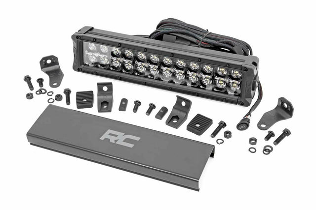 Command the Dark: Light up the night and stay on the trails longer with Rough Country's sleek 12-inch Dual Row CREE LED Light Bar. This powerful light bar offers 10 800 lumens of illumination and 120 watts of energy-efficient output all housed in a stylish modern frame. Featuring 24 high-intensity 5-watt CREE LEDs it delivers superior brightness and durability for any adventure. The sleek black panel design complements vehicles with black accents such as grilles wheels bull bars or steps. Designed for all-weather performance this light bar comes with a durable die-cast aluminum housing ensuring maximum strength and heat dissipation. It s also backed by an IP67 waterproof rating providing reliable performance even in harsh conditions. This light bar contains 12 cool white daytime running LEDs for enhanced visibility and safety. Installation is made simple with the included premium flat-wound wiring harness complete with an on/off switch for easy operation. The light bar also features Rough Country's Light Bar Noise Silencers designed to eliminate unwanted hums whistles and wind noise typically found in mounted LED light bars. This light bar includes both end mounts and adjustable base mounts offering multiple mounting options for maximum versatility. A snap-on cover protects the lens while Moisture Breather technology reduces moisture build-up inside the light. Plus it s all backed by a 3-year warranty for peace of mind.