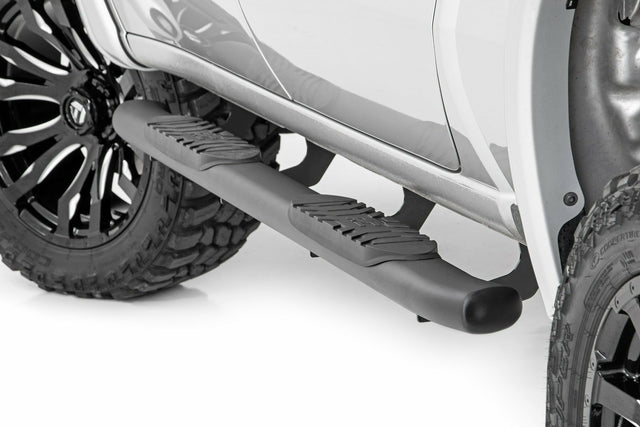 Gain easier access to your cab with the classic OEM look of Rough Country's Oval Nerf Step Bars. These durable steel side steps feature a comfortable 4.5-inch wide stepping area built into a large tubular nerf rail that mimics the look of the popular OEM oval step design. Each nerf board features a long-lasting black powder coat and durable steel construction that can support up to 500lbs! Each step offers a 30-degree angled end design looks great on any vehicle. A secure 4.5-inch wide stepping area features a non-slip pad to ensure a confident footing each and every time.