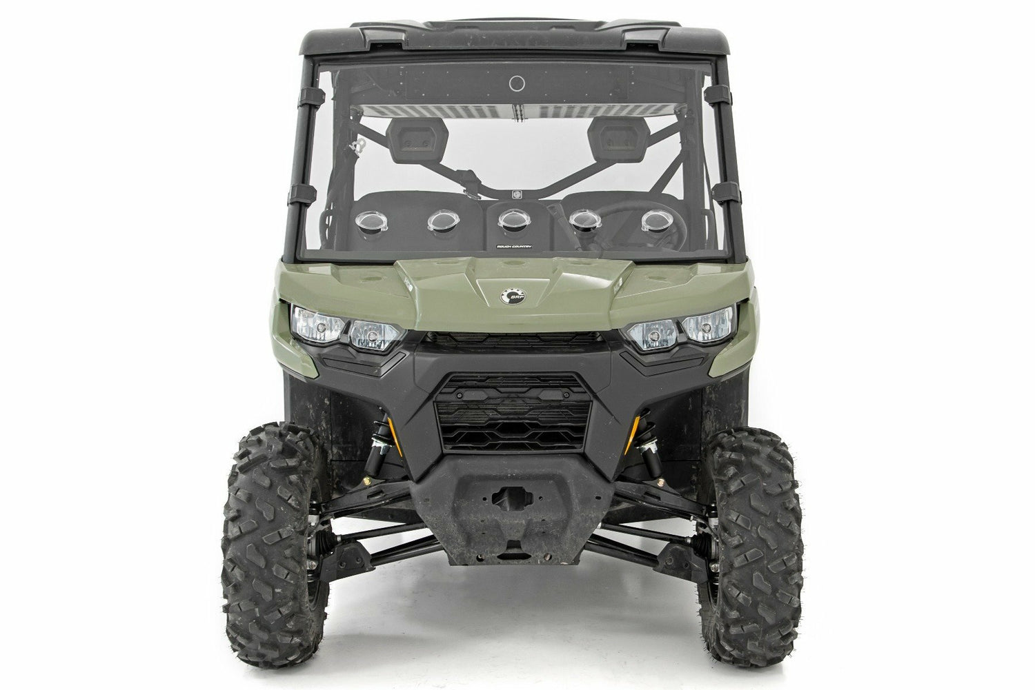 Added Protection and Customizable Comfort: Shield the occupants of your Can-Am Defender from off-road hazards like rocks branches and debris with Rough Country's Scratch-Resistant Windshield. This innovative design combines protection with unmatched comfort by featuring 5 adjustable vents that allow you to control airflow to suit your needs. Vents can be closed opened or half-opened for ultimate versatility. Whether you're navigating dusty trails or keeping cool on hot days the 360 Deg. rotating vents provide superior flexibility making every ride more enjoyable. High-Quality Polycarbonate Construction: Crafted from thick .25 polycarbonate material Rough Country windshields deliver the ultimate combination of clarity flexibility and durability. Precision cut for a flawless fit this material outperforms glass and acrylic in toughness ensuring your windshield can handle even the roughest terrains. Enhanced Durability with Scratch and UV Resistance: Each windshield is coated with a secondary AR2 hard-coating process creating a robust scratch-resistant barrier that extends its lifespan. This treatment also provides UV protection ensuring your windshield remains clear and functional for years to come. Contoured Design with a Precision Fit: The contoured design and premium rubber seal ensure a secure rattle-free fit that keeps out dust debris and water while seamlessly complementing the rugged aesthetics of your Can-Am Defender.; Seamless Roof Compatibility: Engineered to integrate effortlessly with both factory and most aftermarket roofs this windshield adds versatility without compromising style or functionality. Quick and Easy Installation: With a simple strap-on installation process you can have your Rough Country windshield ready to go in as little as 1530 minutes. Spend less time prepping and more time conquering the trails. Limited-Lifetime Replacement Warranty: Rough Country stands behind its products with a limited lifetime replacement warranty against manufacturer defects. Ride with confidence knowing your windshield is protected from structural or workmanship damage.