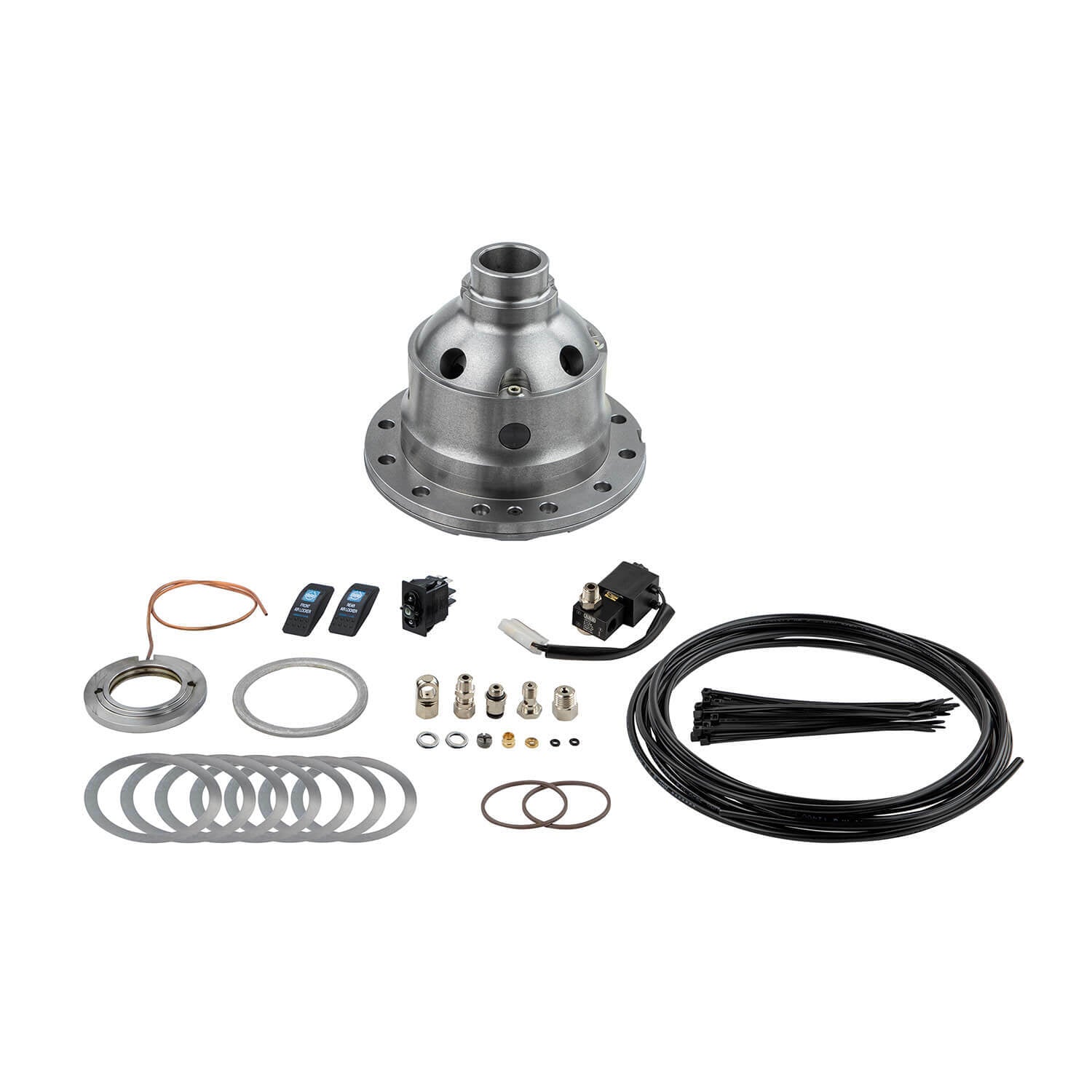 The world's premier traction aid an ARB Air Locker keep you moving in all conditions. With the flick of the switch an Air Locker gives instant lock at any moment and its super strong design allows activation at any speed allowing you to tackle the toughest terrain. The advantage of the Air Locker lies in the pneumatically operated locking system inside the differential. When activated the Air Locker prevents the internal differential gears from rotating and therefore prevents the axle shafts from turning independently of each other. With both wheels tied directly to the rotation of the ring gear the vehicle maintains maximum possible traction at all times. When unlocked it operates like a conventional open differential. An Air Locker equipped vehicle can be driven in a slower safer and more controlled manner greatly reducing the likelihood of vehicle damage and environmental impact.