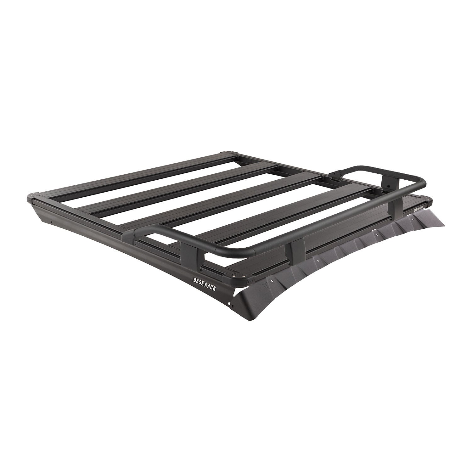 The BASE Rack takes accessories and cargo loading to a whole new level of simplicity speed and personalization. The BASE Rack is fully-welded aluminum for lightweight strength that doesn't flex under load. It can therefore be mounted close to the vehicle roof for a slimline aesthetic and reduced drag. Its dovetail extrusion attachment system runs the full perimeter of the rack and along each internal beam providing endless mounting and attachment options. Adding removing and repositioning accessories and roof loads is quick and easy and individual items may be installed or removed without disturbing the whole load. Unlike traditional roof rack channels the BASE Rack dovetail system doesn't collect dust and debris. This kit includes a 49 in (L) x 45 in (W) BASE Rack mount kit with wind deflector to suit the Toyota Tacoma along with quarter guard rails. The rails attach quickly and easily to the dovetail extrusion around the rack's perimeter with some additional fixing points at the rack corners. Quarter rails allow for ample storage and load security at the front of the rack.