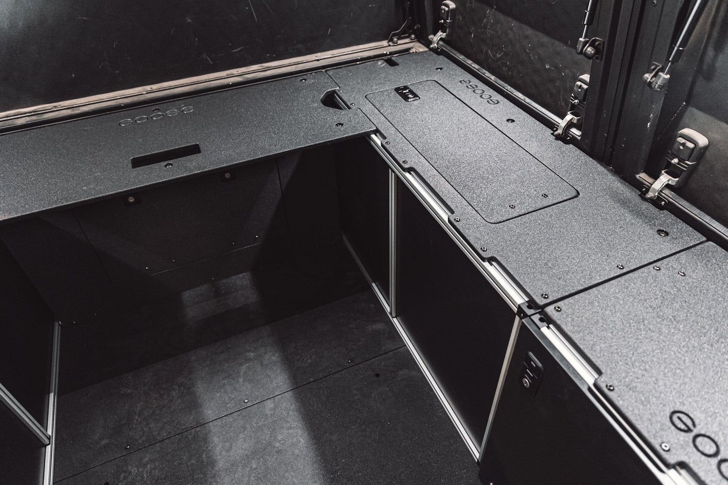 Introducing the all NEW interior system for the all new Alu-Cabin, Full Size Canopy Camper. The Front Utility Module requires the Goose Gear® Bed Plate System™ installation.