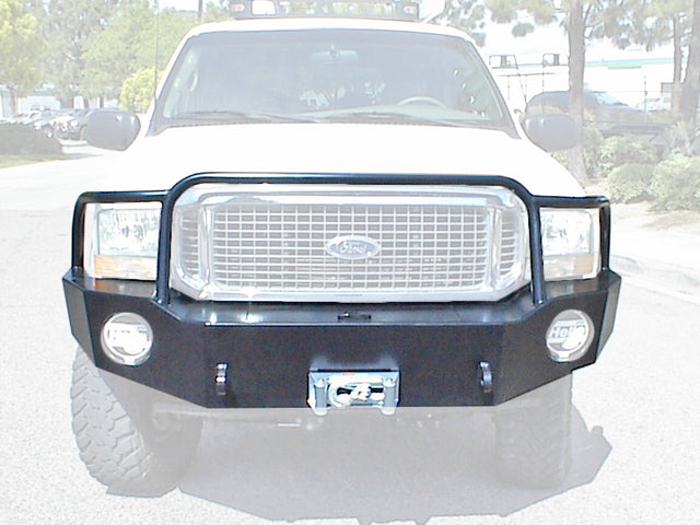 210039-Excursion/Ford F-250/F-350 99-04 Front Bumper With Brush Guard The Aluminess front winch bumper for the 2000-04 Excursions will hold a large winch and come with integrated tow hooks. Wet and salty environments can wreak havoc on steel bumpers and make them rust out in no time. Aluminum doesn’t rust so you can be sure that your Aluminess bumper will hold up even in salty environments. The lighter weight of aluminum also prolongs the life of your brakes tires suspension and steering when compared to steel bumpers. Despite its light weight it is still very strong. Aluminess bumpers have survived collisions with deer bear and elk. The front winch bumper for the 99-05 Excursions were designed specifically for the vehicle to match all of the body lines. This winch bumper looks as good as it functions.