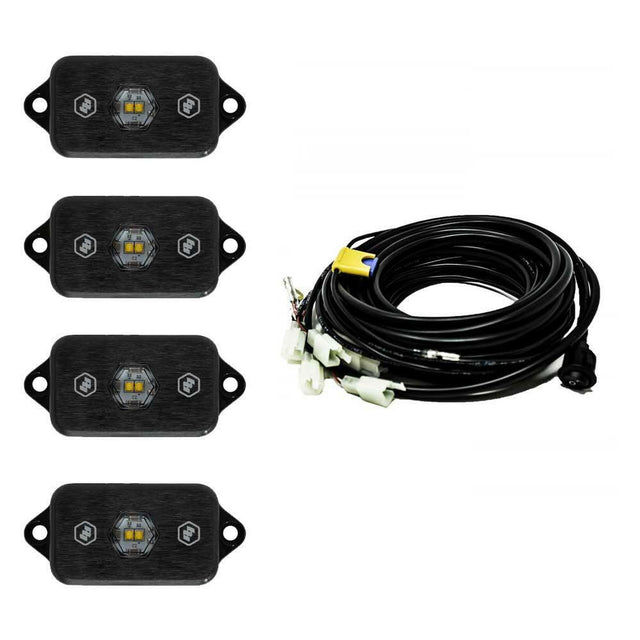 Our Universal Rock Light Kit takes the guess work out of buying wiring and trying to figure out how to pin relays. All of the lengths are pre-cut to reach all four corners of your small to mid-sized vehicle with some wiggle room on each lead to route the wiring any desired way. This kit includes four 400 lumen rock lights and wiring for a truly turn key kit. These LED lights are waterproof and can be mounted virtually anywhere. All that is needed is 12 volt power. They have a 180 degree optic to illuminate your wheel wells or anywhere else you need a bright and smooth light.