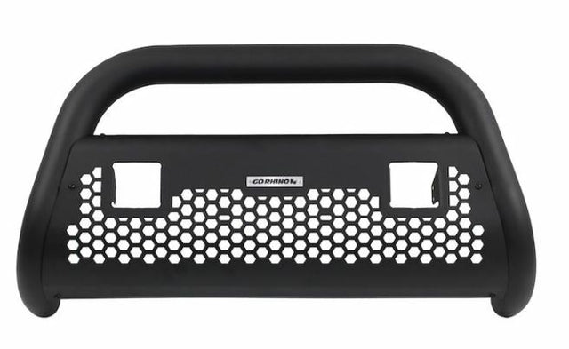 Go Rhino's RC2 LR Bull Bars offer updated styling and the ability to combine today’s popular LED lights with front-end protection. The 3" diameter tubular steel frame features a galvanized steel skid plate with a stylish hexagonal cut out pattern. Different styles are available with light mounts for one 20" single row light bar, two 3" cube lights or four 3" cube lights. In addition, all RC2 LR Bull Bars have pre-drilled light mount holes across the center crossmember. The RC2 LR is available as a standalone as a kit that includes vehicle-specific mounting brackets or as a kit that includes both mounting brackets and LED lights. Installation is easy with no drilling required. RC2 LR Bull Bars come with a Limited Lifetime warranty on materials and construction and a 5 year warranty on the Textured Black Finish.