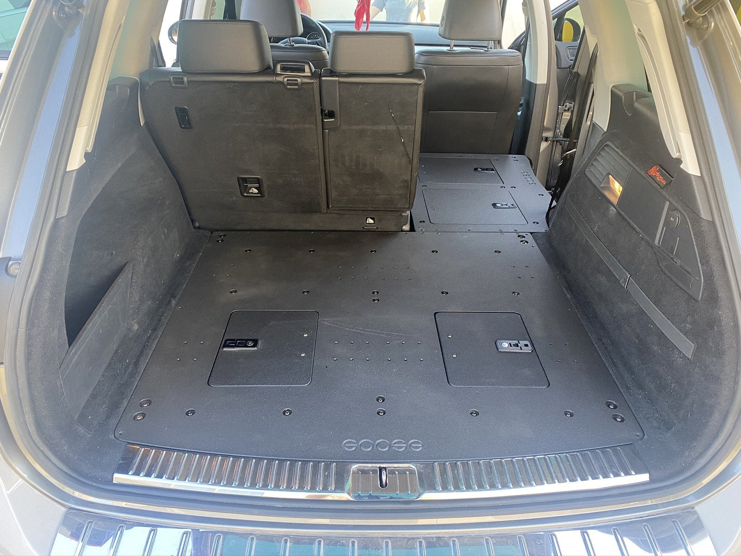 The Porsche Cayenne Second Row Seat Delete Plate System™ allows you can now create a large and flat platform for various uses. This system makes a perfect sleeping platform as well as storage space for larger items you want to keep inside your rig such as surfboards etc.