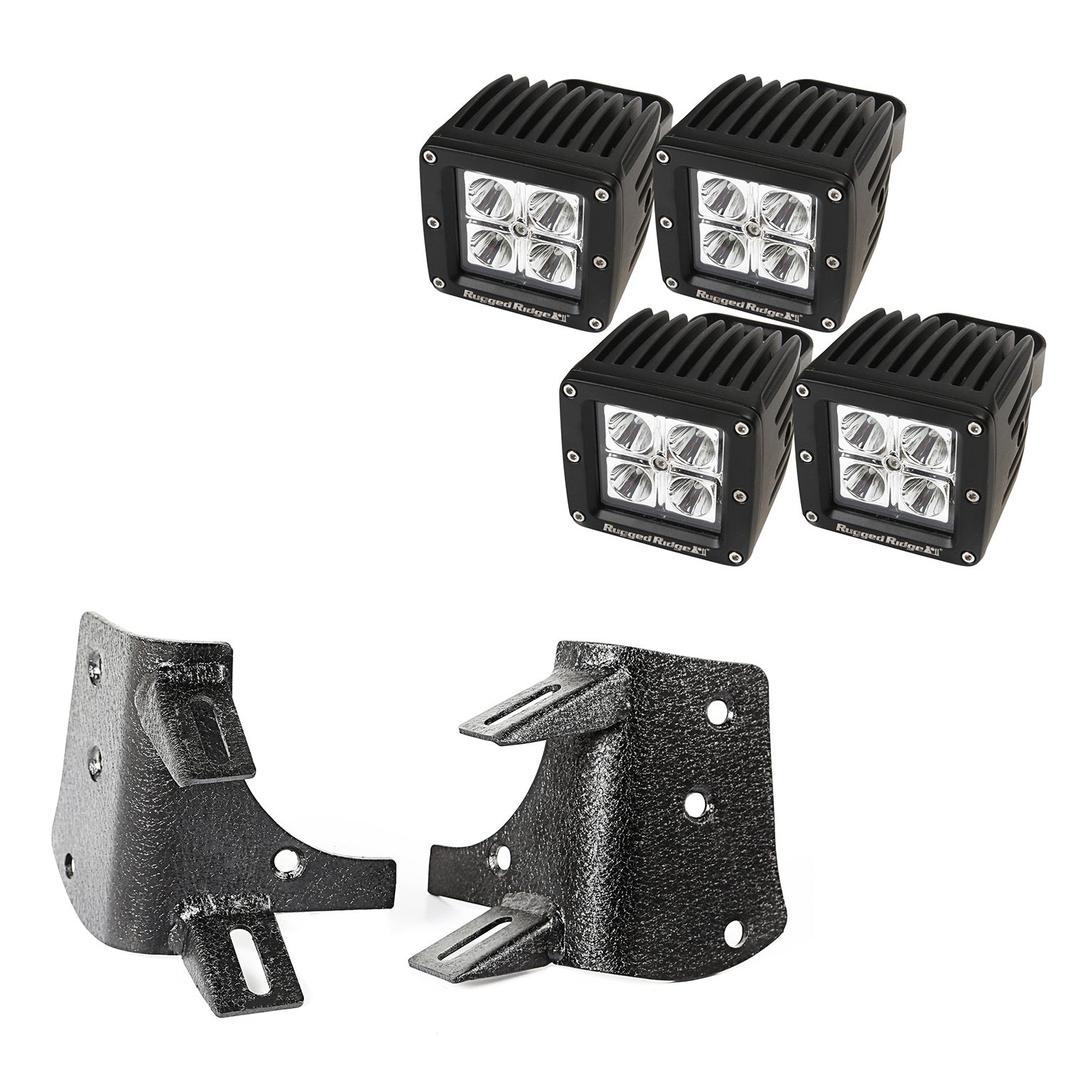 Optimize your off-roading adventure with the best lighting solutions on the market. Designed to accommodate a variety of auxiliary off-road lights, Rugged Ridge designed this dual A-pillar LED light kit to allow you to place lights in positions that yield the most visibility on the trail. Constructed from heavy-duty steel, this kit includes an A-pillar bracket set and four 3-inch square LED driving lights and is easily attached to the lower windshield mount using existing factory mounting holes. No drilling or cutting is required for installation.