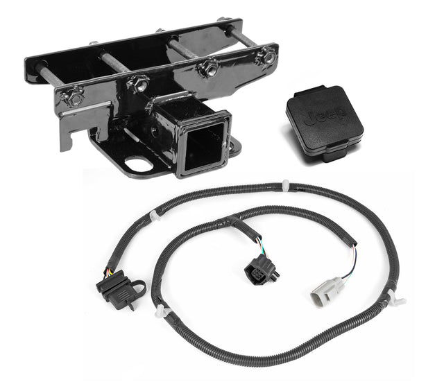 Looking for an accessory to carry your bike rack? Rugged Ridge has you covered with this black 2-inch receiver hitch kit that includes harness and Jeep plug. Designed as a one-piece welded assembly for added strength, we built our hitch receiver to match the towing capacity of your Jeep Wrangler. The custom design bolts directly to factory mounting points on the rear of the vehicle. The powder coated construction sheds water and provides a long lasting rust free finish. Includes cutout for factory wiring harness mounting. Not to exceed recommended vehicle towing capacity. Refer to your owner's manual for detailed information on your vehicle's towing capacity.